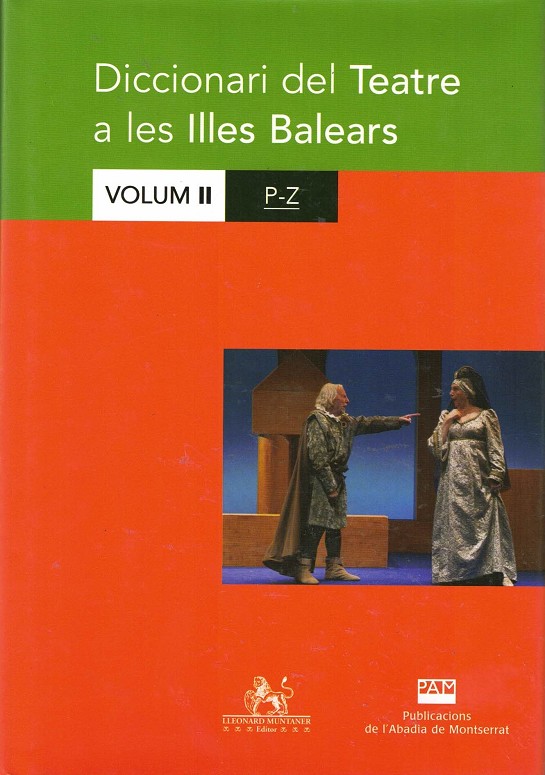 Segon volum del primer treball de conjunt sobre l?activitat escènica produïda a les Illes. Obra de síntesi i de recerca, defuig intencionadament d?identificar el teatre únicament amb la literatura dramàtica i inclou entrades referides a actors i actrius, espais escènics, cantants lírics, grups i companyies teatrals, directors, tramoistes, decoradors, empresaris i productors, músics i promotors, així com també recull informació sobre la música dramàtica o sobre les manifestacions folklòriques o tradicionals que contenen més elements teatrals o parateatrals. Promogut per la Conselleria d?Educació i Cultura del Govern Balear. Coeditat amb Lleonard Muntaner, editor.
