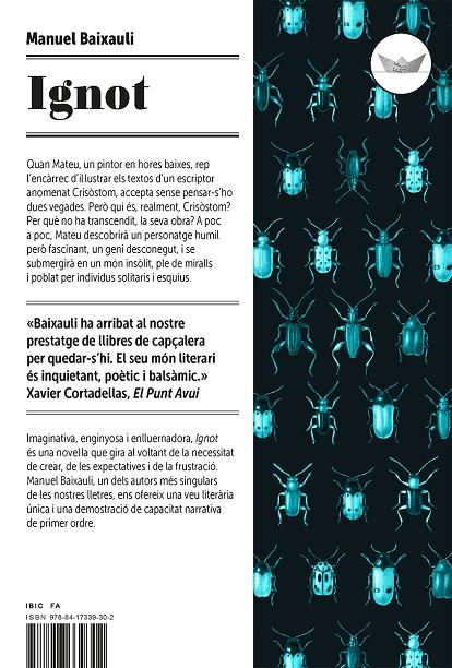 Quan Mateu, un pintor en hores baixes, rep l’encàrrec d’il·lustrar els textos d’un escriptor anomenat Crisòstom, accepta sense pensar-s’ho dues vegades. Però qui és, realment, Crisòstom? Per què no ha transcendit, la seva obra? A poc a poc, Mateu descobrirà un personatge humil però fascinant, un geni desconegut, i se submergirà en un món insòlit, ple de miralls i poblat per individus solitaris i esquius. Imaginativa, enginyosa i enlluernadora, Ignot és una novel·la que gira al voltant de la necessitat de crear, de les expectatives i de la frustració. Manuel Baixauli, un dels autors més singulars de les nostres lletres, ens ofereix una veu literària única i una demostració de capacitat narrativa de primer ordre.