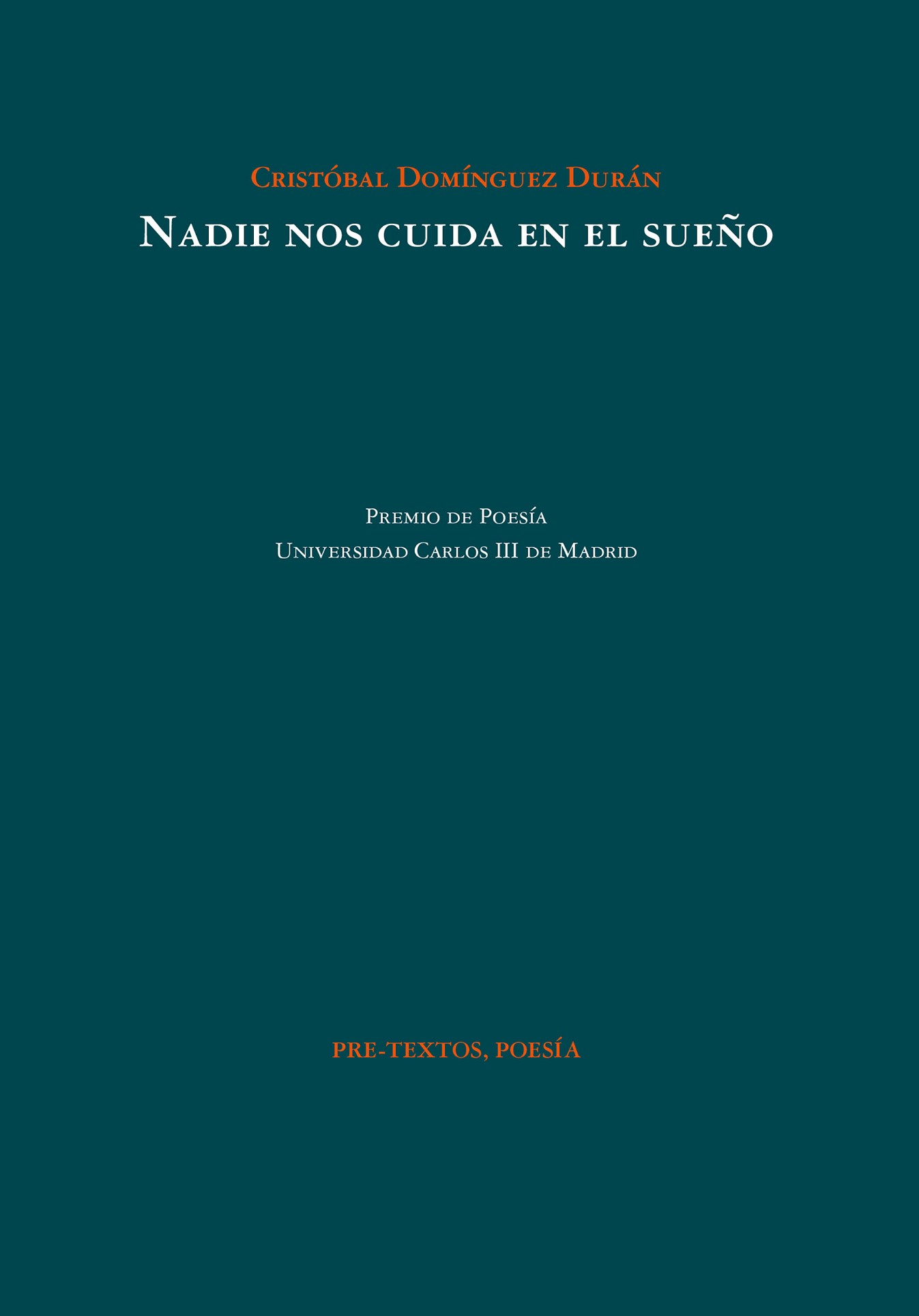 Cristóbal Domínguez Durán (Vejer de la Frontera, Cádiz, 1993) es filólogo y máster en Estudios Literarios y Teatrales (UGR). En 2018 publicó Secuelas, libro que ganó el XXXIX Premio de Poesía Arcipreste de Hita. Nadie nos cuida en el sueño es su segunda obra publicada. El jurado del II Premio de Poesía Universidad Carlos III de Madrid decidió, por unanimidad, darle el galardón por ser «un libro que rebosa talento imaginativo, con multitud de imágenes sencillas, claras y luminosas y una voz poética propia, original y sorprendente».