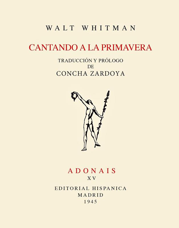 Cantando a la primavera se publicó en Adonáis en 1945. Además de que acercó a los lectores españoles a la deslumbrante e influyente voz poética del norteamericano Walt Whitman, tuvo el atractivo e interés de que la traducción y el prólogo eran de la española de origen chileno Concha Zardoya, la primera mujer que editó en la colección un poemario suyo (Pájaros del nuevo mundo, 1946) y, después, con Dominio del llanto (1947), obtuvo un accésit en el primer fallo del Premio Adonáis ya bajo la dirección de Ediciones Rialp. Los tres volúmenes son inencontrables hoy día si no es en librerías de viejo.